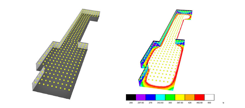 الابعاد: الطول 254م، العرض 49م، الارتفاع 10م. ترتيب مصابيح السقوف 4م * 6م.