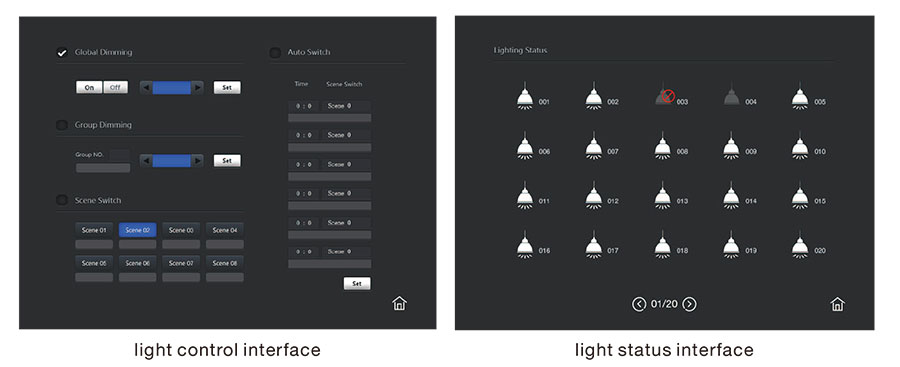 YAHAM verfügt über professionelle intelligente Lichtsteuerungssysteme. Sobald das System gestartet hat, klicken Sie irgendwo auf das Startmenü. Sie müssen für 10 Sek. warten, bis die Daten synchronisiert werden und dann wird die Navigationsschnittstelle aufgerufen. Es gibt 5 Navigationssymbole: Lichtsteuerung, Beleuchtungsstatus, Lichtszenen-Inszenierung, Zeitplan und Systemeinstellungen.