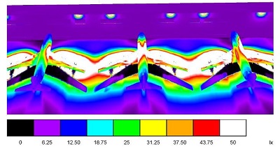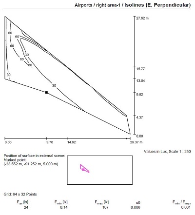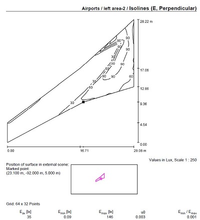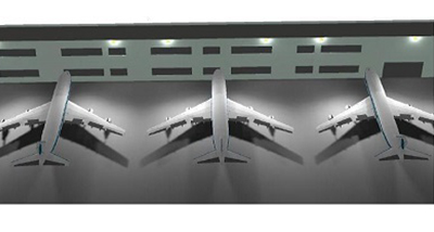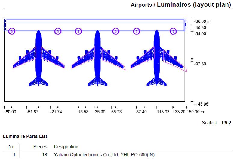 Basiskonfiguration: Insgesamt: 3 Flugzeugparkplätze, jede Tragfläche mit 3 Stk. 600 W LED-Hochmastleuchten. Insgesamt: 18 Stk..