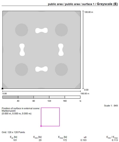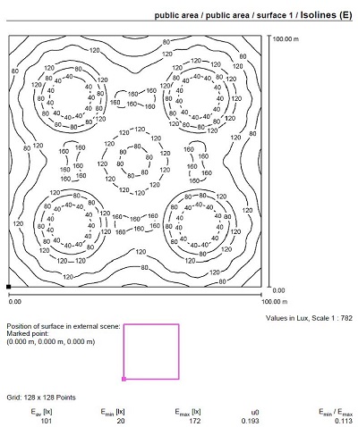 Basiskonfiguration: 300 W Hochmastleuchte, Höhe der Leuchten: 20 m, 12 Stk. an jedem Mast. Insgesamt: 48 Stk.