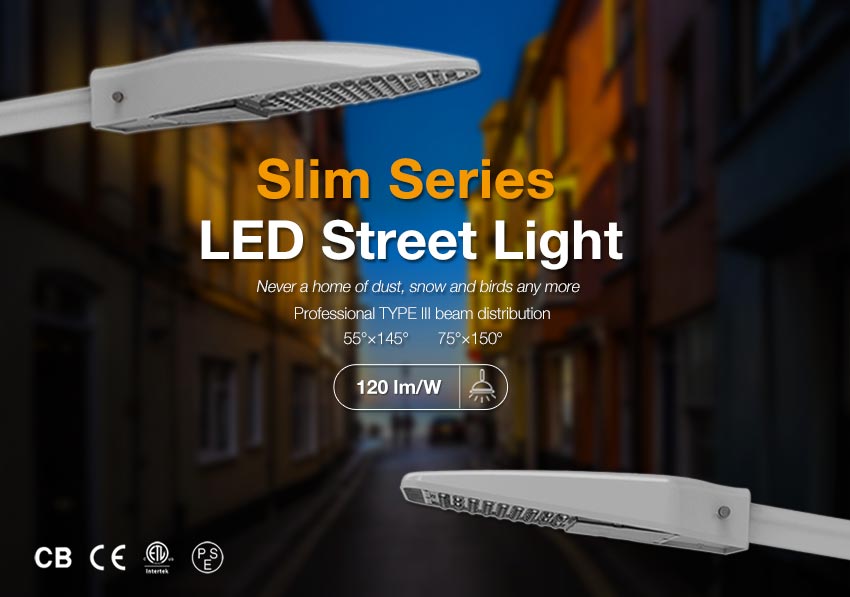 Slim Series LED street light installation height is relatively low, the suggested installation height is below 8 meters, with high brightness and uniformity (>0.7). Moreover, it has low glare, TI<12, luminous efficiency >110 lm/W.