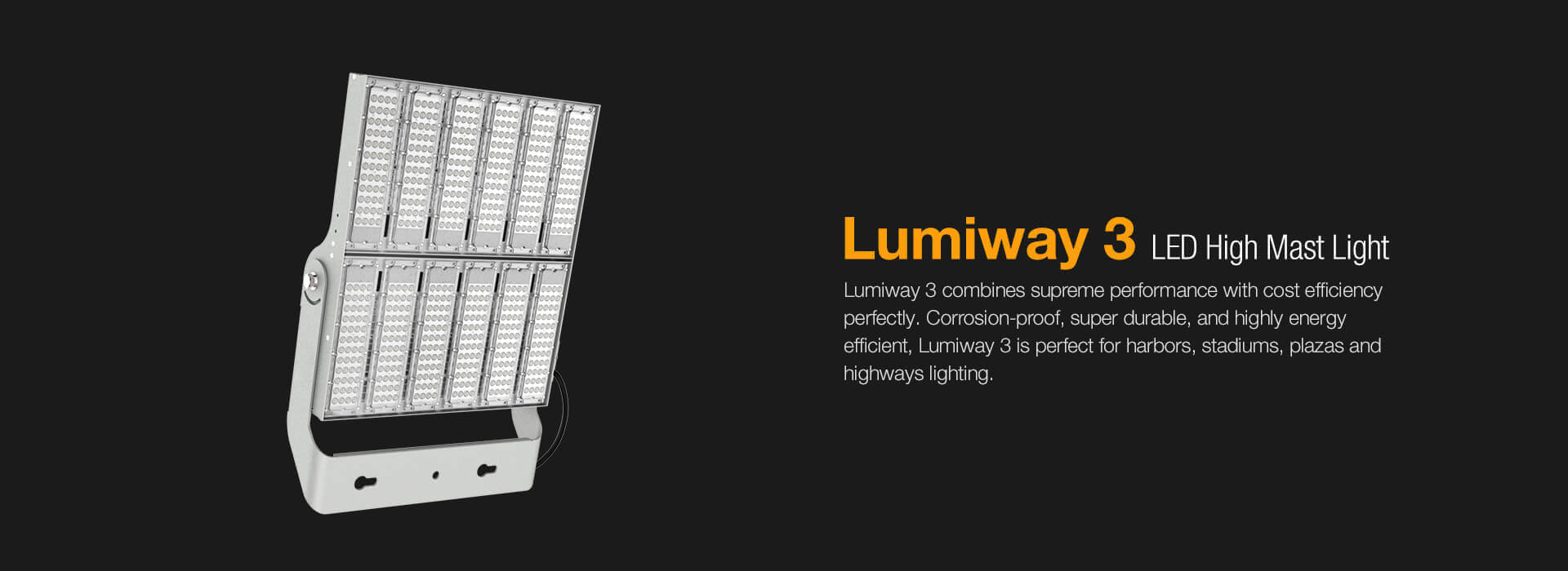 Светильник Lumiway 3 LED High Mast со специальной линзой, минимальной ветровой площадью и большой светоотдачей является одним из наиболее профессиональных и экономичных идеальных решений для освещения больших территорий, в том числе спортивных площадок, площадей, парковок, автомагистралей и т. д.